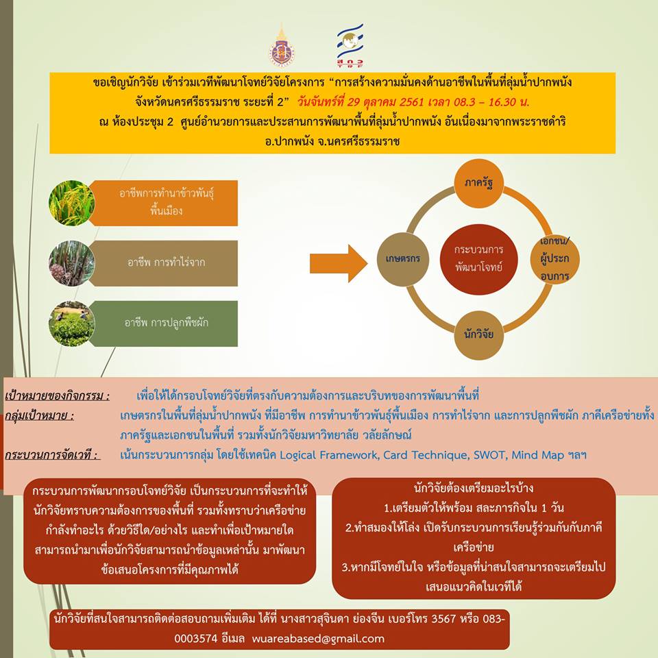 ตามประกาศมหาวิทยาลัยวลัยลักษณ์ เรื่อง รับข้อเสนอโครงการวิจัยกลุ่มเรื่อง นวัตกรรมเพื่อการพัฒนาพื้นที่ โครงการ การสร้างความมั่นคงด้านอาชีพในพื้นที่ลุ่มน้ำปากพนัง จังหวัดนครศรีธรรมราช ระยะที่ 2 ประจำปี 2561 กำหนดเปิดรับข้อเสนอโครงการวิจัยฯ โดยส่งมายังสถาบันวิจัยและนวัตกรรม มหาวิทยาลัยวลัยลักษณ์ ภายในวันที่ 4 มกราคม 2562 นั้น