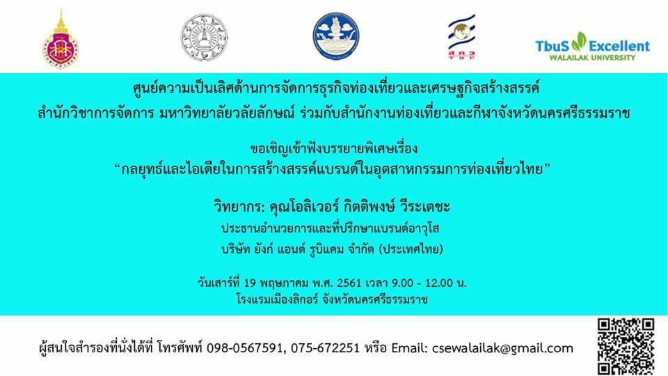 16 พฤษภาคม 2561 เวลา 09.00 น. – 14.00 น. ณ ห้องประชุม 4 อาคารปฎิบัติการเทคโนโลยีและพัฒนานวัตกรรม มหาวิทยาลัยวลัยลักษณ์
