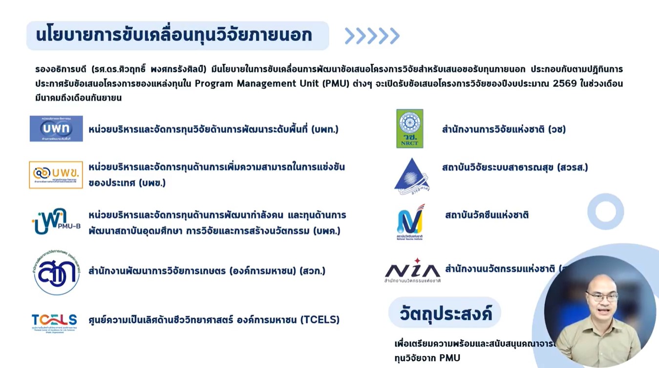 กิจกรรมครั้งนี้ได้รับเกียรติจาก รองศาสตราจารย์ ดร.ศิวฤทธิ์ พงศกรรังศิลป์ รองอธิการบดี มหาวิทยาลัยวลัยลักษณ์ เป็นประธานเปิดงาน กล่าวต้อนรับผู้เข้าร่วมกิจกรรม พร้อมมอบนโยบายและเน้นย้ำถึงความสำคัญของการวิจัยในการขับเคลื่อนมหาวิทยาลัยสู่การเป็นสถาบันชั้นนำระดับประเทศและระดับนานาชาติ