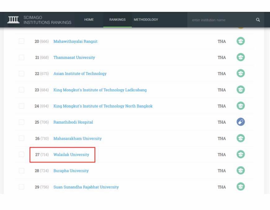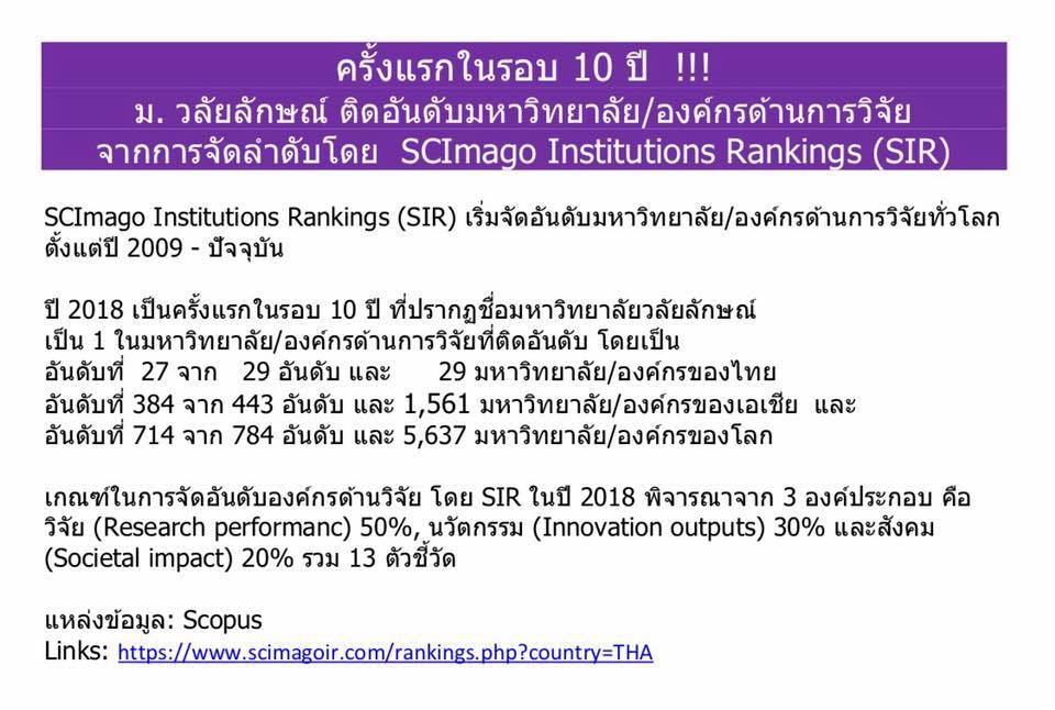 SCImago Institutions Rankings (SIR) เริ่มจัดอันดับองค์กรด้านการวิจัยทั่วโลก ตั้งแต่ปี 2009 – ปัจจุบัน ในรอบ 9 ปีที่ผ่านมา มีองค์กรด้านการวิจัยไทย ติดอันดับ จำนวน 17-24 องค์กร โดยไม่เคยปรากฎชื่อของมหาวิทยาลัยวลัยลักษณ์