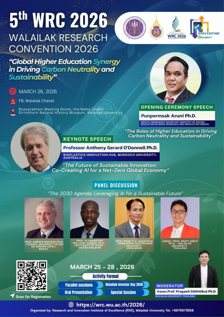 Walailak University, through the Research and Innovation Institute of Excellence (RIIE), cordially invites researchers, academics, students, and interested participants to attend The 5th Walailak Research Convention 2026 (WRC 2026), taking place on March 25–28, 2026, at Walailak University, Nakhon Si Thammarat, Thailand.