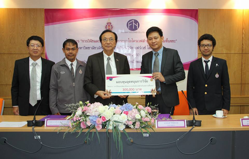 ศาสตราจารย์ ดร.สมบัติ ธำรงธัญวงศ์ รักษาการแทนอธิการบดีมหาวิทยาลัยวลัยลักษณ์ รับมอบทุนอุดหนุนการวิจัย โครงการ “การวิจัยและพัฒนาต้นแบบระบบไมโครเวฟสำหรับลดความชื้นขยะ” จาก นายธเนศ วิชชุไตรภพ กรรมการผู้จัดการ บริษัท แฟร์เวย์ โฮลดิ้ง จำกัด ในการนี้มี อาจารย์ ดร.ผานิตย์ คุ้มฮิ้น ผู้อำนวยการสถาบันวิจัยวิทยาการสุขภาพ และผู้แทนจากบริษัท แฟร์เวย์ โฮลดิ้ง ร่วมเป็นเกียรติในการลงนามสัญญารับทุน เมื่อวันที่ 31 กรกฎาคม 2560 ณ ห้องประชุม 1 หน่วยประสานงานมหาวิทยาลัยวลัยลักษณ์ กรุงเทพมหานคร