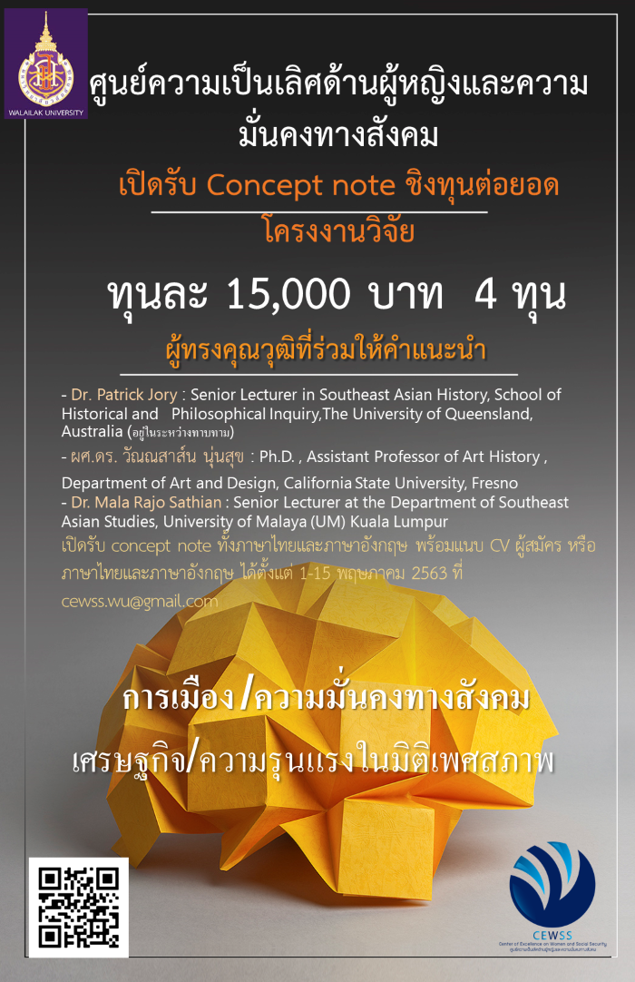 เปิดรับ concept note ทั้งภาษาไทยและภาษาอังกฤษ พร้อมแนบ curriculum vitae ผู้สมัคร หรือภาษาไทยและภาษาอังกฤษ ตั้งแต่ 1-15 พฤษภาคม 2563 ไม่เกิน 1 หน้า ทางอีเมล cewss.wu@gmail.com