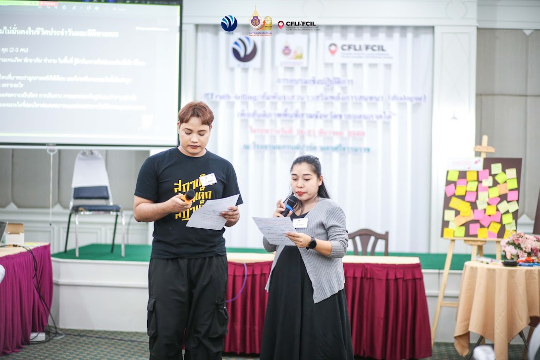 On the first day, the workshop officially opened with activities aimed at raising awareness of safe spaces for speaking and listening. The sessions were facilitated by Ms. Fareeda Jiraporn, who led activities to build familiarity and trust through applied theatre techniques. This was followed by the activity “Peaceful Communication: Empower and Empathy,” facilitated by Mr. Suphasawat Buranavej. The final activity of the day, “The Unspoken Stories: How Can We Speak Them?”, was presented through short theatrical performances, with special facilitation by Assistant Professor Khalid Midam from the School of Languages and General Education, Walailak University.