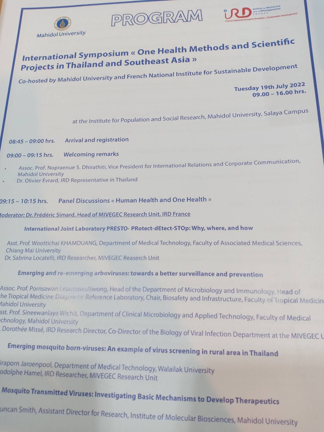 การจัดประชุม International Symposium (One Health Methods and Scientific Projects in Thailand and Southeast Asia) เมื่อวันที่ 19 July 2022 จัดโดย Institiut de Recherch pourle Développment (IRD) ร่วมกับมหาวิทยาลัยมหิดลเป็นเจ้าภาพ ในการประชุมครั้งนี้มีผู้แทนสถาบันต่าง ๆ ที่มี Collaboration กับ IRD เข้าร่วม อาทิ มหาวิทยาลัยเชียงใหม่ มหาวิทยาลัยเกษตรศาสตร์ มหาวิทยาลัยดล CIRAD, FAO, WHO และ CDC ในการนี้ อาจารย์ ดร.จิราพร เจริญพูล ตัวแทนศูนย์ความเป็นเลิศไข้เลือดออกและสาธารณสุขชุมชน เข้าร่วมนำเสนองานวิจัยในโครงการ INGENIOUS ภายใต้ความร่วมมือกับสถาบัน IRD และ คณะเวชศาสตร์เขตร้อน มหาวิทยาลัยมหิดล รวมทั้งได้ต่อยอดความร่วมมือด้านการวิจัย Student/staff mobility, และ Visiting professor ที่จะมีขึ้่้นต่อไป
