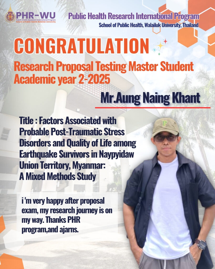 Congratulations to all Master of Public Health Research (PHR) students who have successfully completed their Research Proposal Testing, held between 15–17 October 2025 at Walailak University. This accomplishment reflects your hard work, dedication, and determination to advance in the field of public health research. May this milestone inspire you to continue your journey toward creating meaningful impacts on health and well-being in our communities.