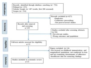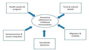 This comprehensive review synthesizes findings from 21 studies (2016–2025) and explores key factors shaping parental adherence to childhood immunization in marginalized Asian populations. The study identifies five major domains influencing immunization behaviors: