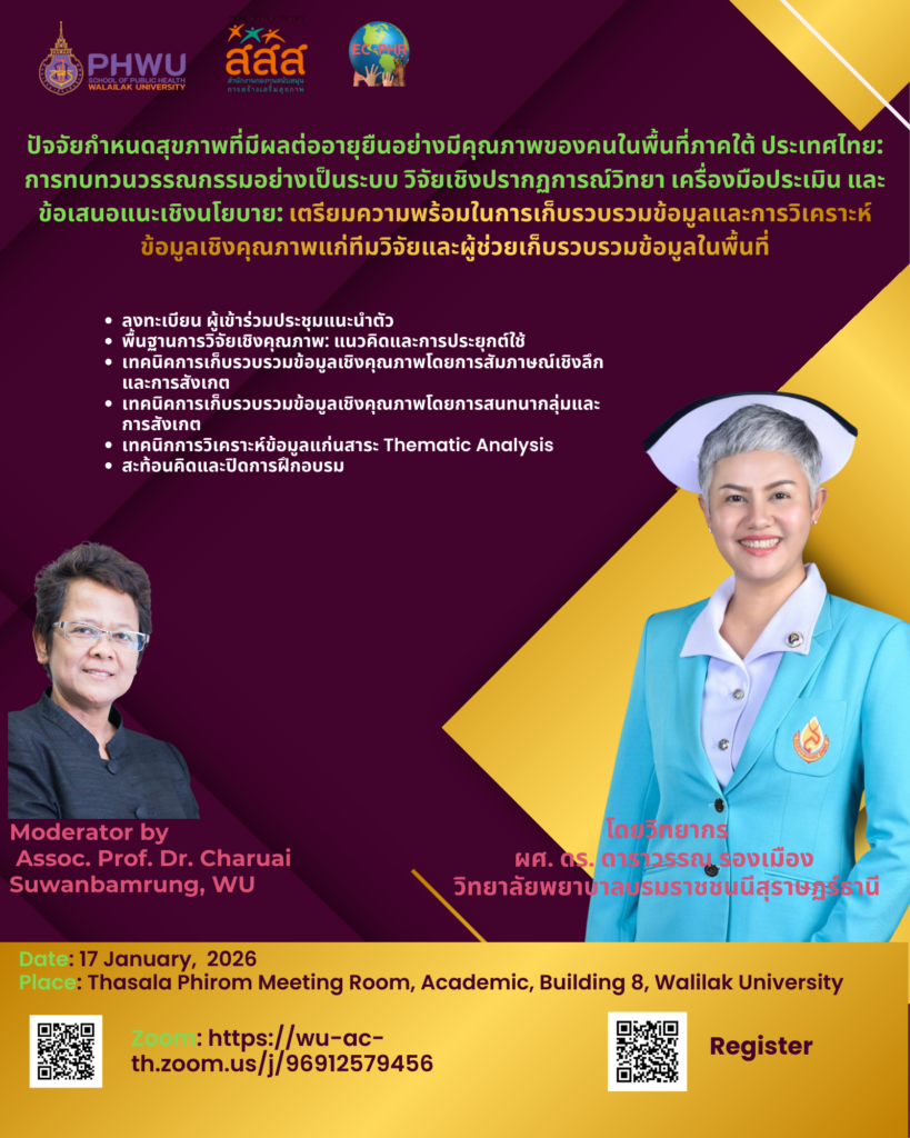 🔬 “ปัจจัยกำหนดสุขภาพที่มีผลต่ออายุยืนอย่างมีคุณภาพของคนในพื้นที่ภาคใต้ ประเทศไทย : การทบทวนวรรณกรรมอย่างเป็นระบบ วิจัยเชิงปรากฏการณ์วิทยา เครื่องมือประเมิน และข้อเสนอแนะเชิงนโยบาย”