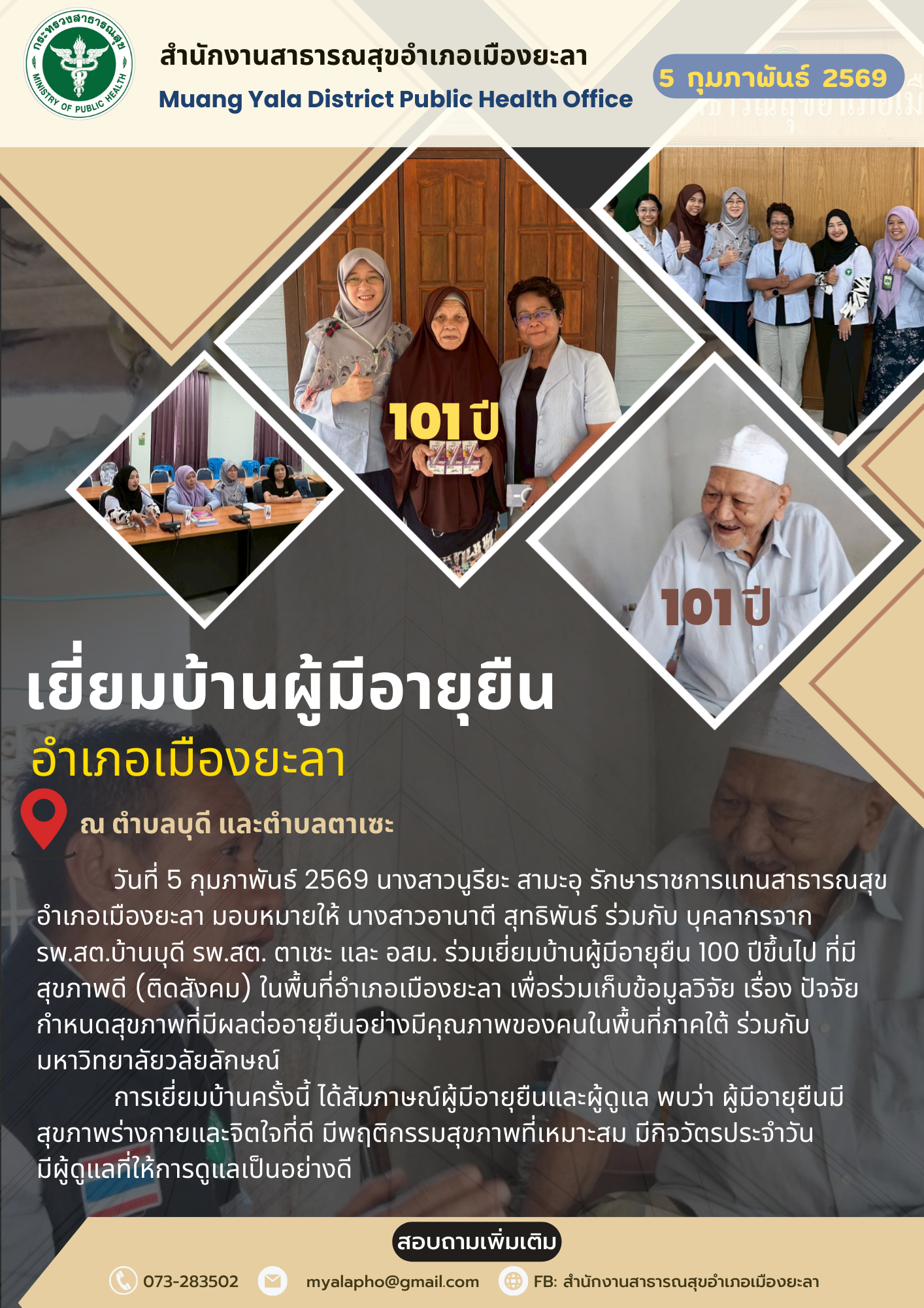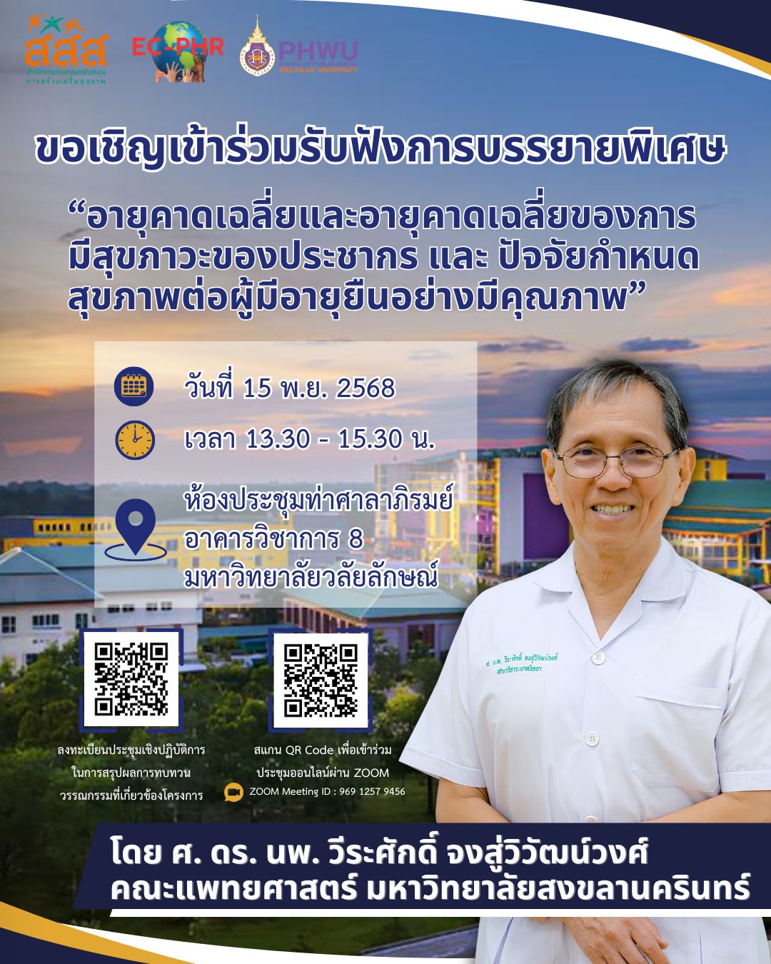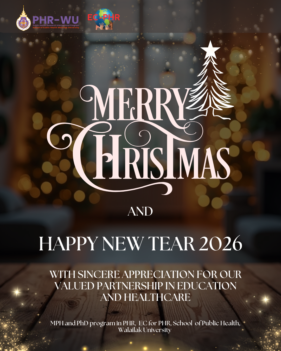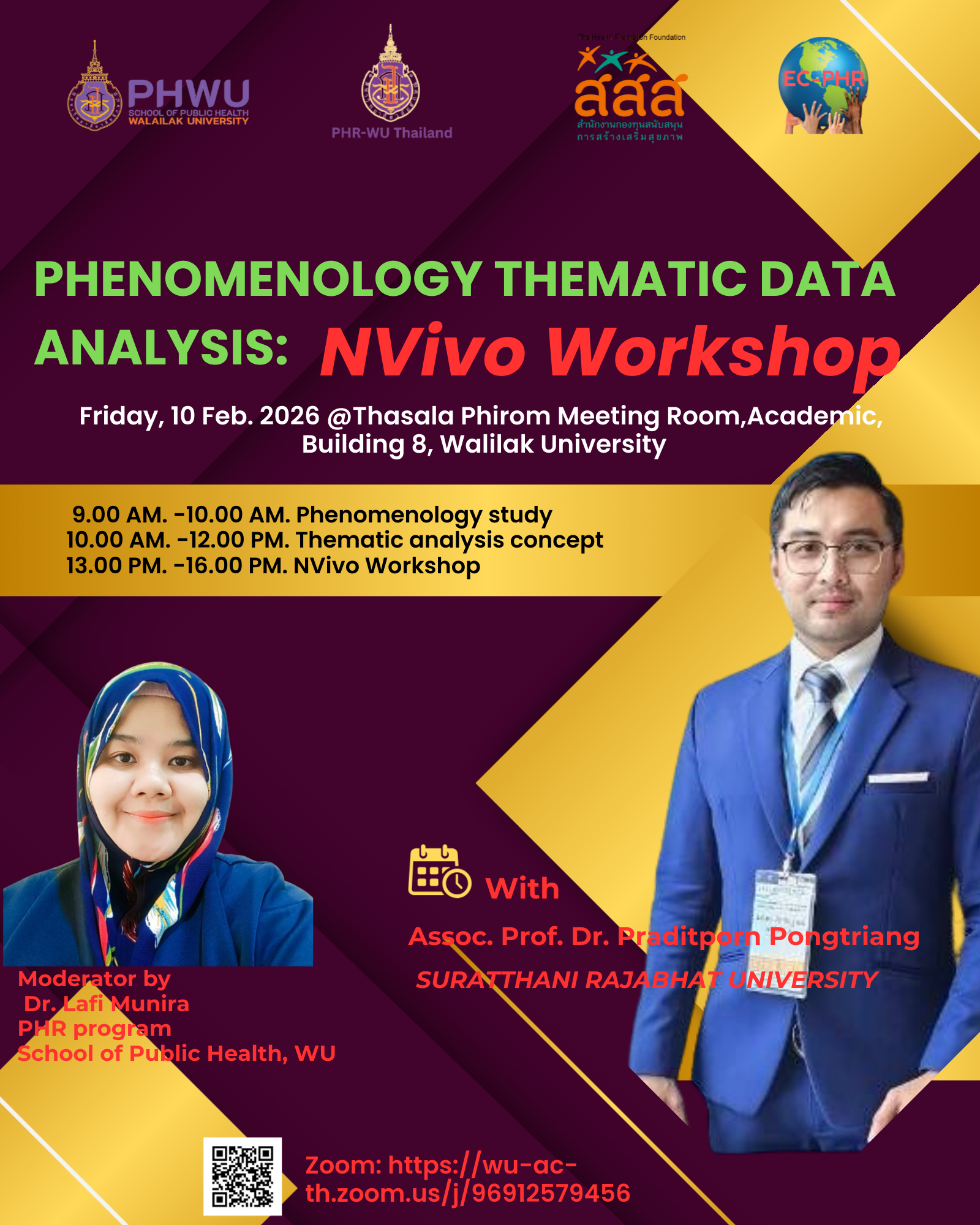 เยี่ยมบ้านผู้มีอายุยืนในพื้นที่อำเภอเมืองยะลา Read More » February 6, 2026 PHENOMENOLOGY THEMATIC DATA ANALYSIS: NVivo Workshop Read More » January 29, 2026 ประชุมเชิงปฏิบัติการ (Workshop) เตรียมความพร้อมในการเก็บรวบรวมและวิเคราะห์ข้อมูลเชิงคุณภาพ Read More » January 17, 2026 Hybrid International Conference in Thailand Education for Sustainable Public Health: Building Capacity, Resilience, and Equity for Future Generations Read More » January 9, 2026 Merry Christmas & Season’s Greetings Read More » December 24, 2025 Meeting EC for PHR on 1-2026 Read More » December 23, 2025 ประมวลภาพบรรยากาศกิจกรรม WorkShop สรุปผลการดำเนินงาน เฟสที่ 1 การทบทวนวรรณกรรมอย่างเป็นระบบ (Systematic Review) Read More » December 20, 2025 การเตรียมจัดงานประชุมวิชาการระดับนานาชาติ “Walailak Research Convention 2026” Read More » December 9, 2025 บรรยากาศกิจกรรม Workshop การทบทวนวรรณกรรมอย่างเป็นระบบ “Quality Longevity” Read More » November 21, 2025 เก็บตกบรรยากาศการบรรยายพิเศษ โดย ศ. ดร.นพ. วีระศักดิ์ จงสู่วิวัฒน์วงศ์ Read More » November 15, 2025 ขอเชิญเข้าร่วมรับฟังการบรรยายพิเศษ 🎙 Read More » November 12, 2025 Faculty of Public Health Visits and Exchanges Knowledge with Bangkhen Health Center, Nonthaburi Municipality Read More » November 7, 2025 « Previous Page1 Page2 Page3 Page4 Page5 Next »