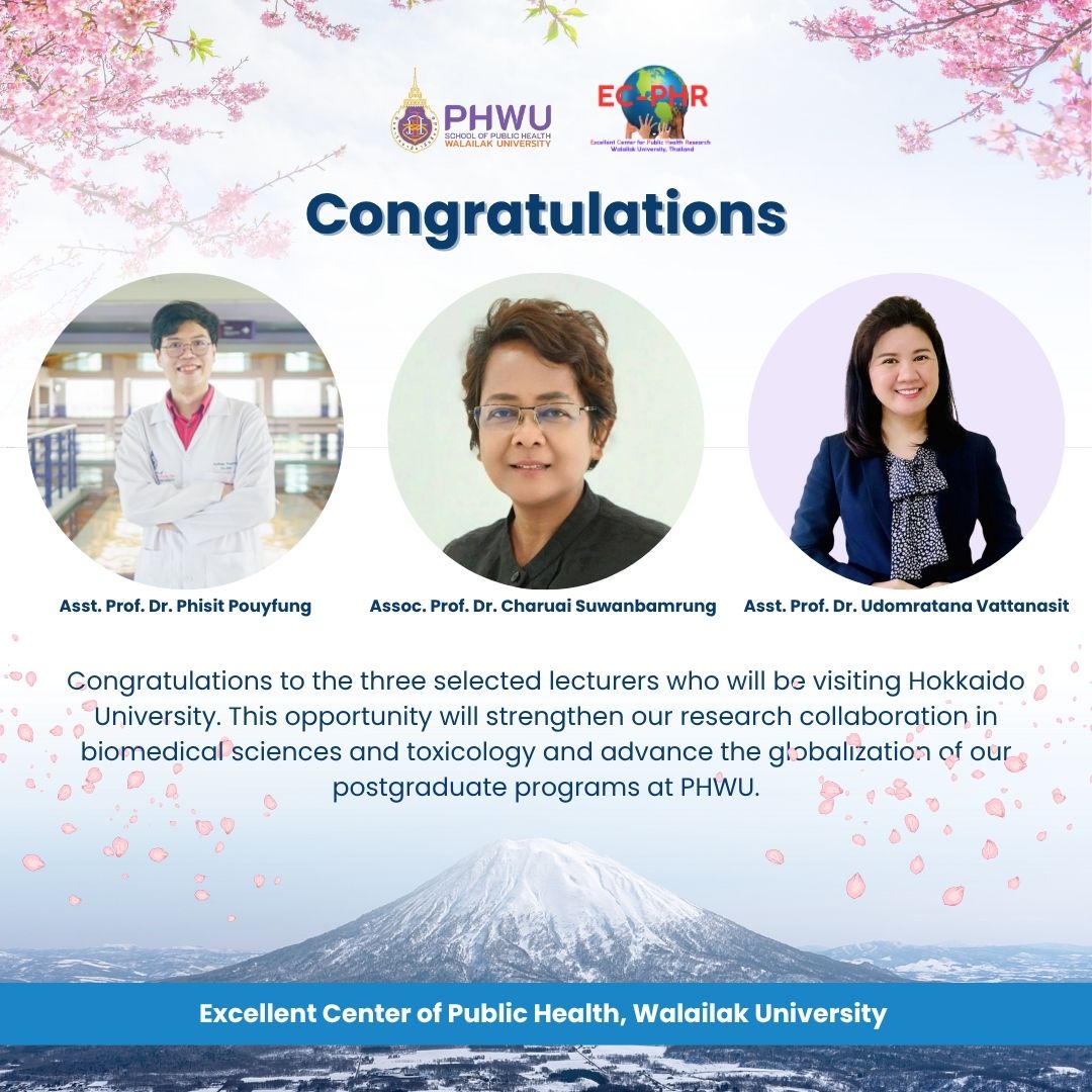 PHWU Faculty Members Travel to Hokkaido to Strengthen International Research Collaboration Read More » August 5, 2025 Research Center Members Join “Grad Connect Day 2025” to Build Global Research Networks Read More » August 5, 2025 School of Public Health, Laksan University, Participated as Academic Presentation Committee at the Southern Disease Prevention and Control Conference Read More » July 23, 2025 Congratulations : Assist. Prof. Dr. Saowaluk Krainara Read More » July 14, 2025 Congratulations : Assoc. Prof. Dr. Nirachon Chutipattana Read More » July 14, 2025 systematic review 1-2025 Read More » July 4, 2025 Epistemology in Public Health Read More » July 4, 2025 Post-event News MPH. and Ph.D. Programs Jointly Host “Orientation Day” for Academic Year 1/2025 Read More » June 26, 2025 PHR students signed an agreement to officially join the Master of Public Health and Doctor of Philosophy Program in Public Health Research. Read More » June 24, 2025 Excellent Center for Public Health Research Read More » June 11, 2025 Facebook Page of the Excellent Center of Public Health, Walailak University Read More » June 3, 2025 Dr. Tassanu Ruangsuwan Read More » May 22, 2025 « Previous Page1 Page2 Page3 Page4 Page5 Next »