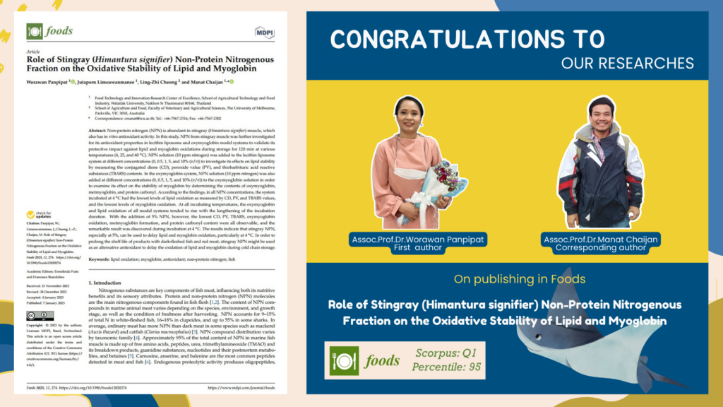 Congratulations to our researchers, Assoc. Prof. Dr. Manat Chaijan and Assoc. Prof. Dr. Worawan Panpipat, on publication in Foods (Q1): Role of Stingray (Himantura signifier) Non-Protein Nitrogenous Fraction on the Oxidative Stability of Lipid and Myoglobin
