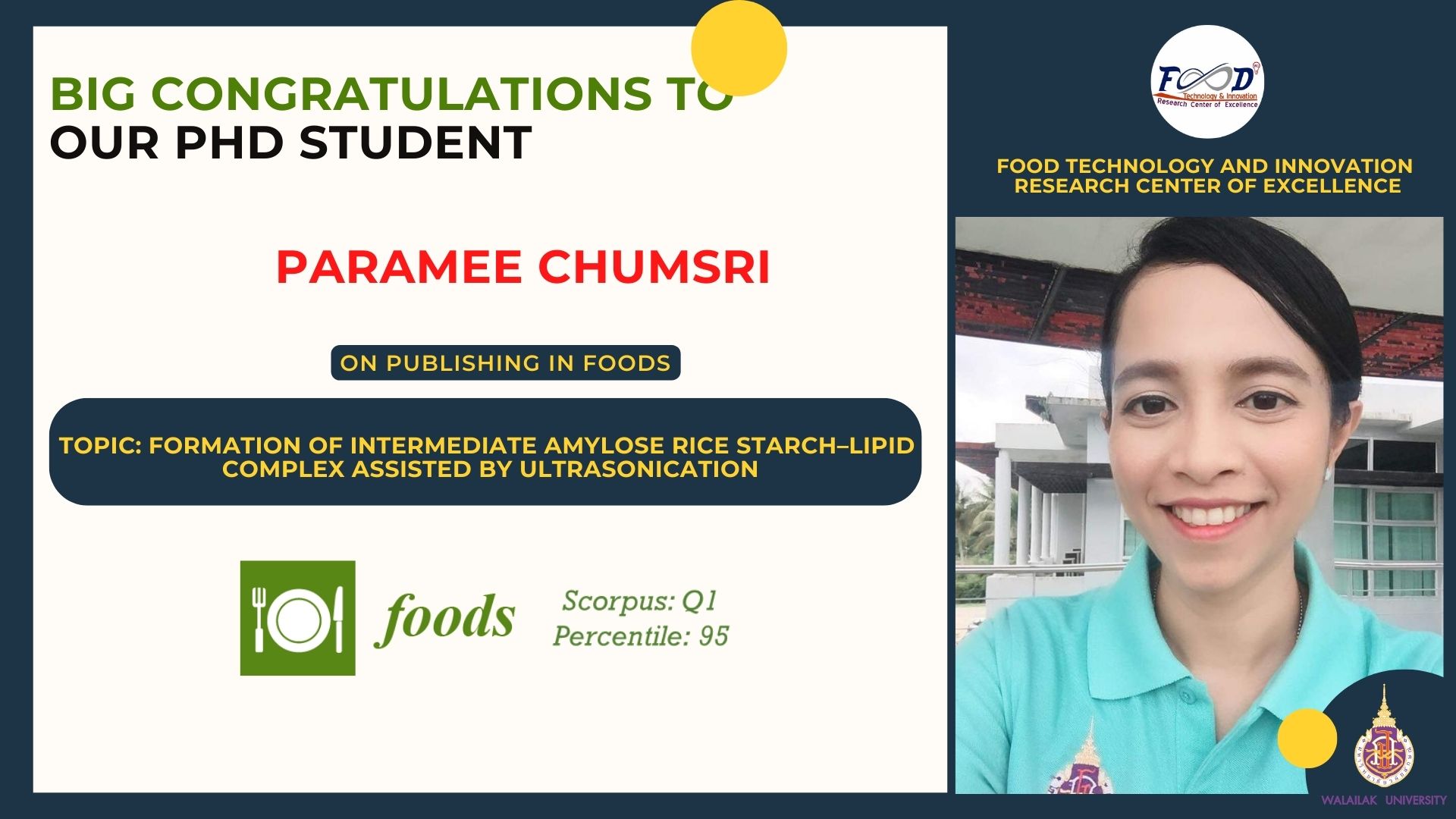 Congratulations on publication in Foods (Q1) by Miss. Paramee Chumsri , a PhD. Student of Food Technology and Innovation CoE ,Topic : “Formation of Intermediate Amylose Rice Starch–Lipid Complex Assisted by Ultrasonication.”