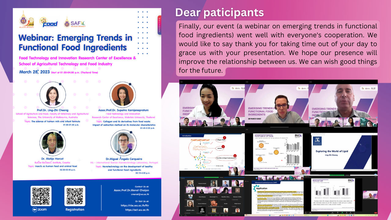 School of Agricultural Technology and Food Industry Together with the Center of Excellence in Food Technology and Innovation, held a webinar on Emerging Trends in Functional Food Ingredients on March 28, 2023 from 13:00-16:00 hrs., honored by 4 world-renowned researchers. as keynote speakers, including