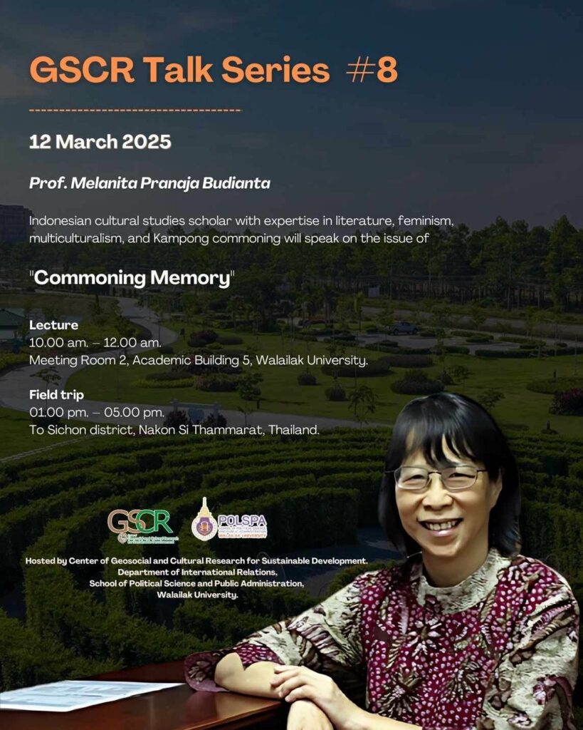 ขอเชิญผู้สนใจ เข้าร่วมรับฟังการบรรยายในหัวข้อ… “Commoning Memory” โดย Prof. Melanita Pranaja Budianta Indonesian cultural studies scholar with expertise in literature, feminism, multiculturalism, and Kampong commoning ซึ่งจะมีขึ้นในวันพุธที่ 12 มีนาคม 2568 เวลา 10.00 -12.00 น. ณ ห้องประชุม 2 อาคารวิชาการ 5 มหาวิทยาลัยวลัยลักษณ์ ** การบรรยายในครั้งนี้ ดำเนินการโดย Center of Geosocial and Cultural Research for Sustainable Development ร่วมกับ สาขาวิชาความสัมพันธ์ระหว่างประเทศ หลักสูตรรัฐศาสตร์ สำนักวิชารัฐประศาสนศาสตร์