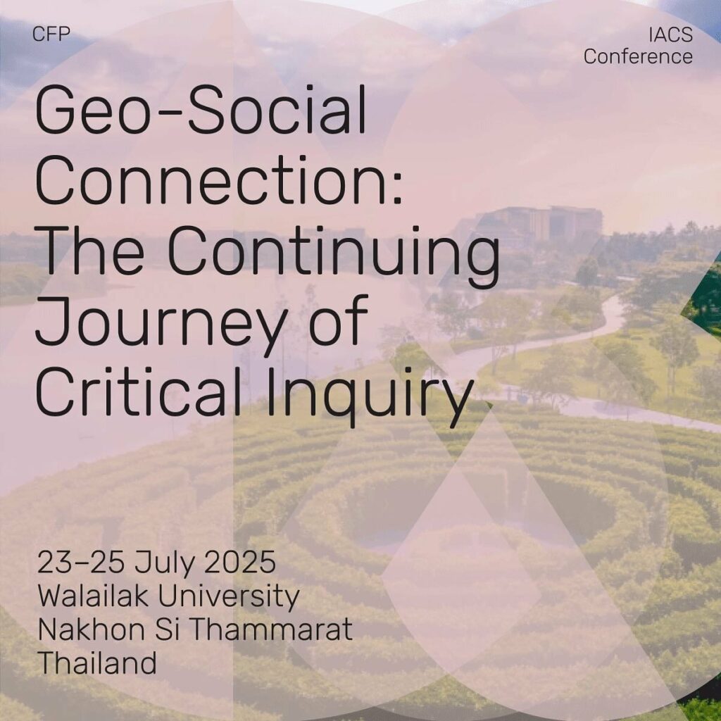 2025 IACS Conference GEO-SOCIAL CONNECTION: THE CONTINUING JOURNEY OF CRITICAL INQUIRY 23-25 July 2025 Walailak University Nakhon Si Thammarat, Thailand Website: iacs2025.com contact: iacs2025wu@gmail.com We are pleased to announce the 2025 IACS Conference theme: “Geo-Social Connection: The Continuing Journey of Critical Inquiry.” We introduce “geo-social” as a conceptual tool to capture Inter-Asian connections that go beyond […]