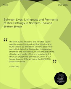 2025 IACS Dissertation Prize Winner This year, we received forty nominations from Australia, Canada, Germany, Hong Kong, India, Indonesia, Japan, the Netherlands, Singapore, the UK, and the US. The dissertations reflect a wonderfully diverse range of critical issues that are grounded in, converge across, and transcend, Asia. Our jury consisting of Professors Fran Martin (chair), Yiu-fai Chow, Sharmani Gabriel, and Madhuja Mukherjee took on the tremendous task of reviewing all submissions. They noted that the overall quality of the submissions was exceptionally high, making the selection process both challenging and genuinely exciting. After much deliberation and discussion, the jury selected Sirithorn Siriwan as the winner of the 2025 prize, for the outstanding dissertation titled, “Between Lives: Livingness and Remnants of Rice Ontology in Northern Thailand”. Congratulations, Sirithorn Siriwan, on winning the 2025 Inter-Asia Cultural Studies Dissertation Prize. We also extend our sincere thanks to all the participants for entering this year’s competition. We wish you all the best in your further careers. For the jury’s full response to the winning dissertation, please visit our website: https://culturalstudies.asia/2025-iacs-dissertation…/