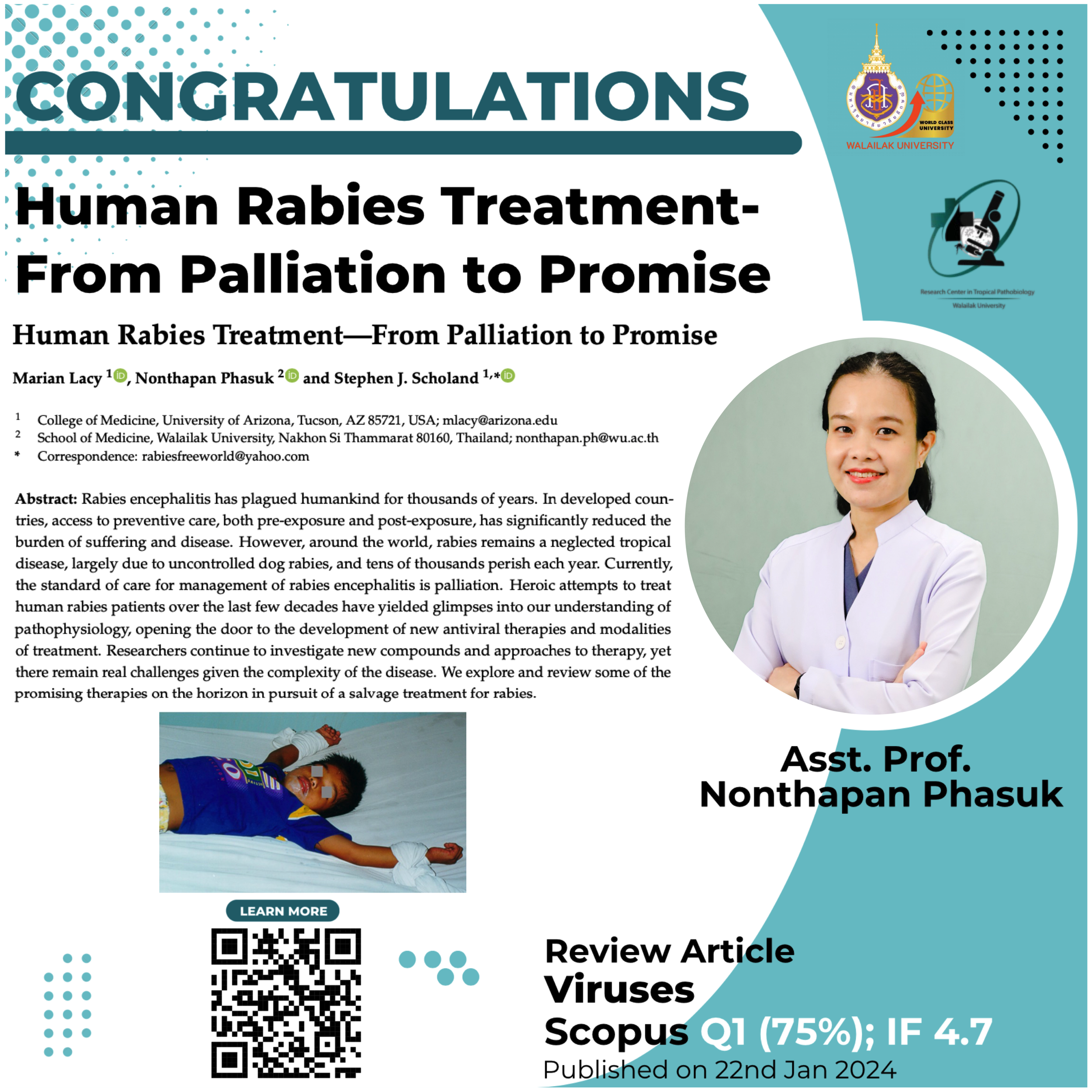The Research Center in Tropical Pathobiology congratulates Asst. Prof. Nonthapan Phasuk (Co-author) on the acceptance of her research for publication in the Viruses, which is listed in the Scopus Q1 database with a percentile of 75% and an Impact Factor (IF) of 4.700. Read more at https://doi.org/10.3390/v16010160