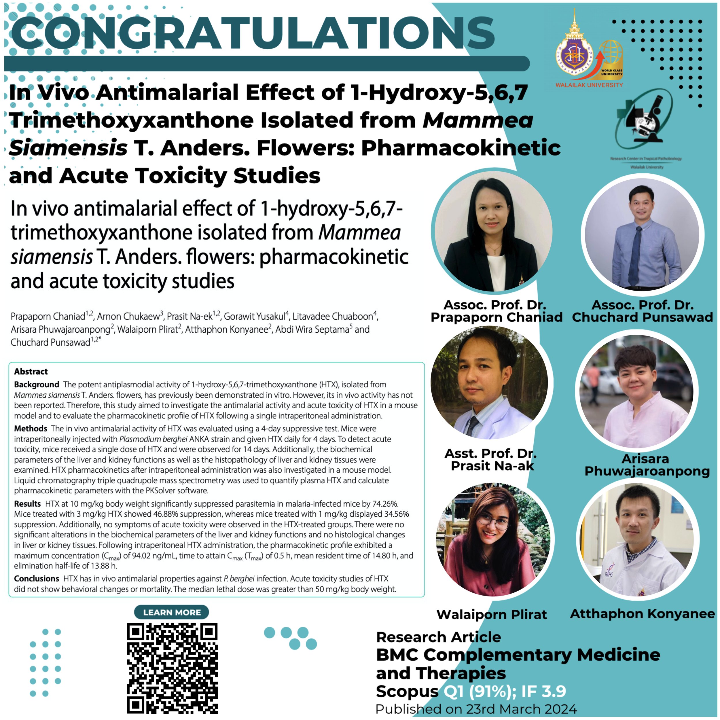 The Research Center in Tropical Pathobiology congratulates Assoc. Prof. Dr.Prapaporn Chaniad (First author), Asst. Prof. Dr.Prasit Na-Ek (Co-author), Miss Arisara Phuwajaroanpong (Co-author), Miss Walaiporn Plirat (Co-author), Mr. Atthaphon Konyanee (Co-author) and Assoc. Prof. Dr. Chuchard Punsawad (Corresponding author) on the acceptance of their research for publication in the BMC Complementary Medicine and […]