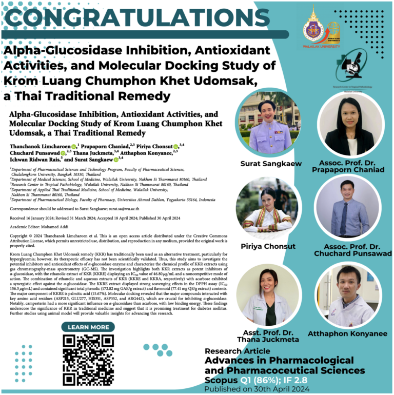 The Research Center in Tropical Pathobiology congratulates Mr.Surat Sangkaew (Corresponding author), Assoc. Prof. Dr.Prapaporn Chaniad (Co-author), Miss.Piriya Chonsut (Co-author), Assoc. Prof. Dr. Chuchard Punsawad (Co-author), Asst. Prof. Dr.Thana Juckmeta (Co-author), and Mr. Atthaphon Konyanee (Co-author) on the acceptance of their research for publication in the Advances in Pharmacological and Pharmaceutical Sciences, which is listed in the Scopus Q1 database with a percentile of 86% and an Impact Factor (IF) of 2.800. Read more at https://doi.org/10.1155/2024/1322310
