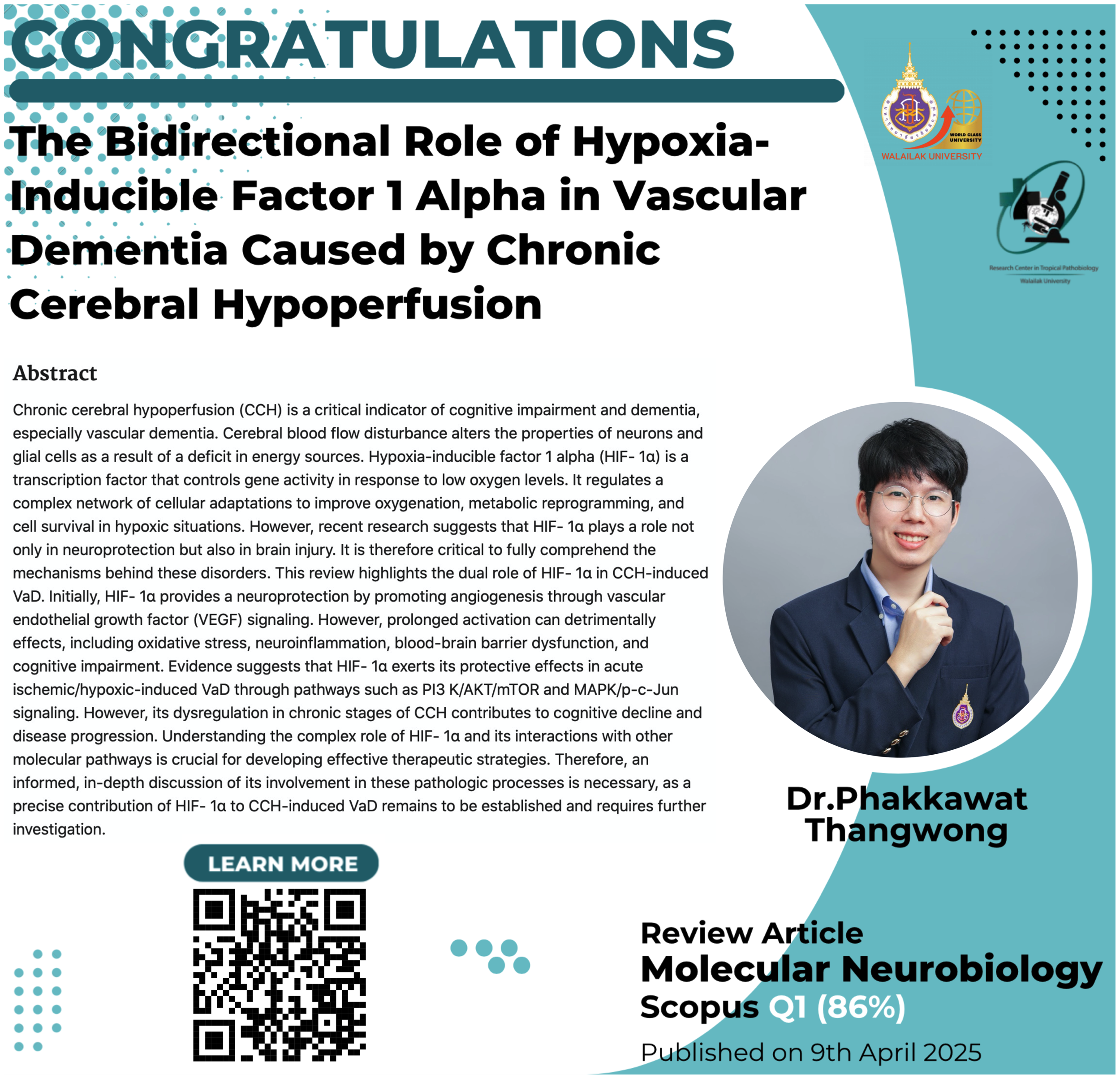 The Center of Excellence in Tropical Pathobiology would like to extend our heartfelt congratulations to Dr. Pakawat Tangwong (First author), a faculty researcher at the Center, whose research has been accepted for publication in Molecular Neurobiology, a Scopus Q1 journal with a Percentile of 86. Read the full article here: […]