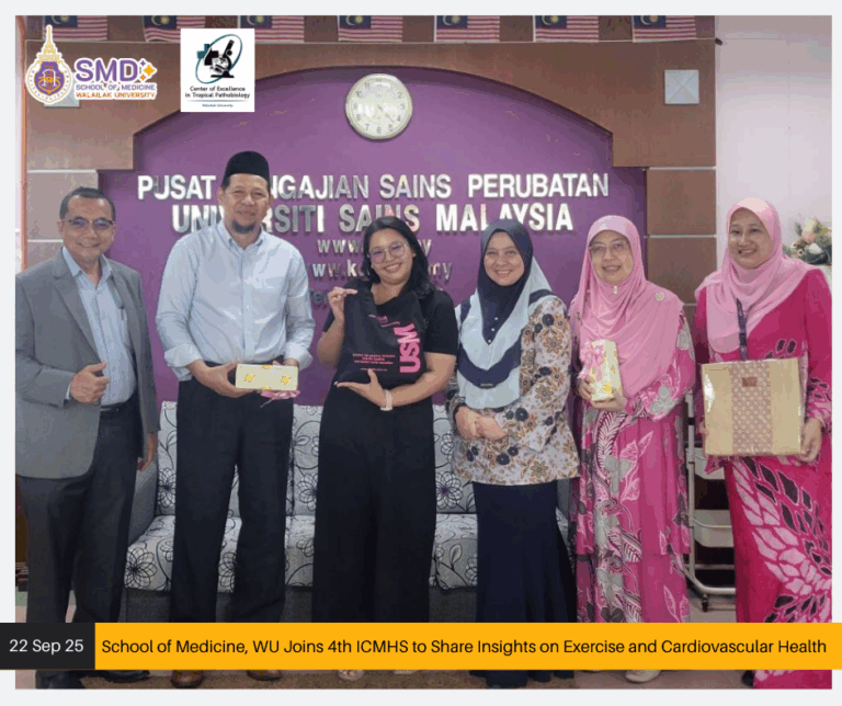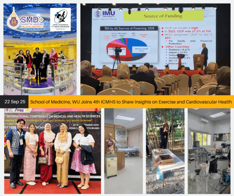 On September 22, 2025, representatives from the School of Medicine, Walailak University, together with members of the Center of Excellence in Tropical Pathobiology, were honored to serve as invited speakers at the 4th International Conference on Medical and Health Sciences (4th ICMHS). The event was held in conjunction with the ASEAN Medical Schools Network (ARCF) and the 25th National Conference on Medical and Health Sciences.