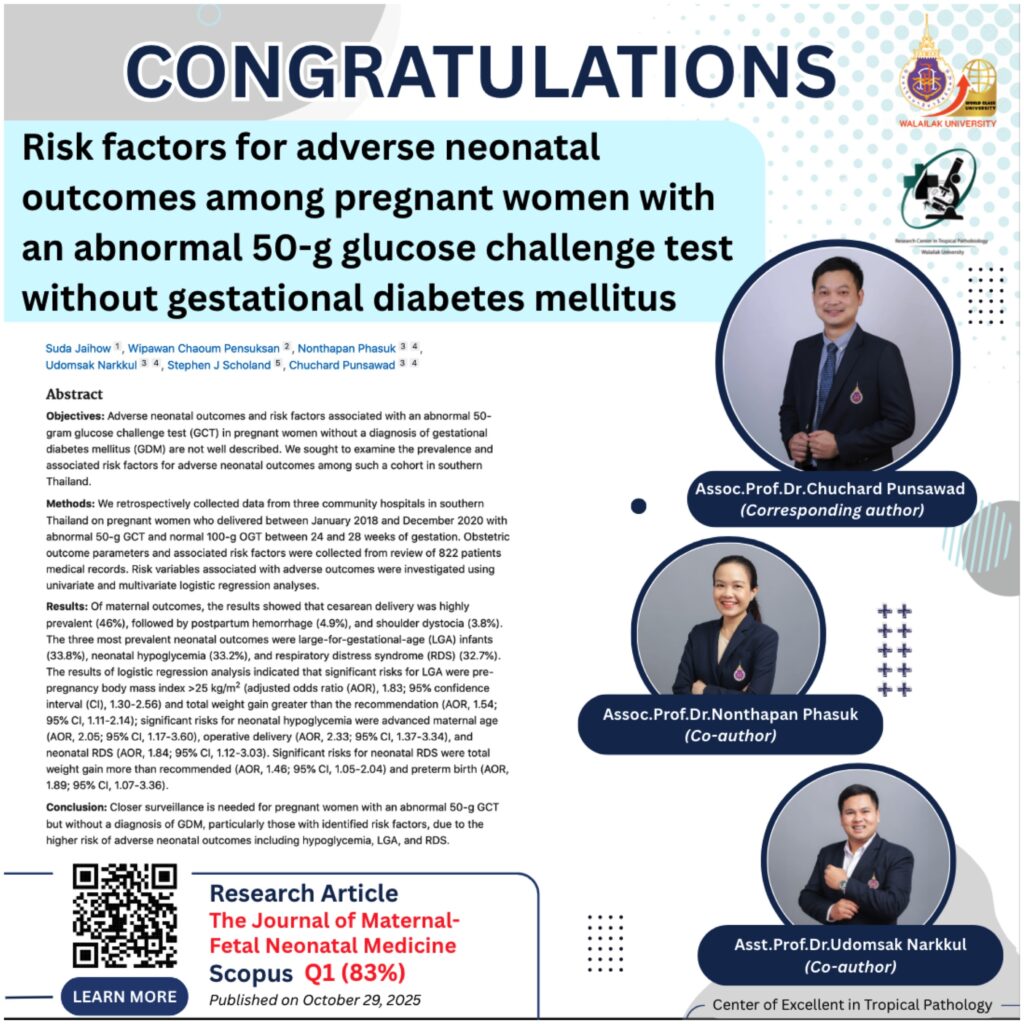 The Center of Excellence in Tropical Pathobiology proudly congratulates our faculty researchers on their successful publication in The Journal of Maternal-Fetal & Neonatal Medicine, a Scopus Q1 journal with a Percentile of 83.
