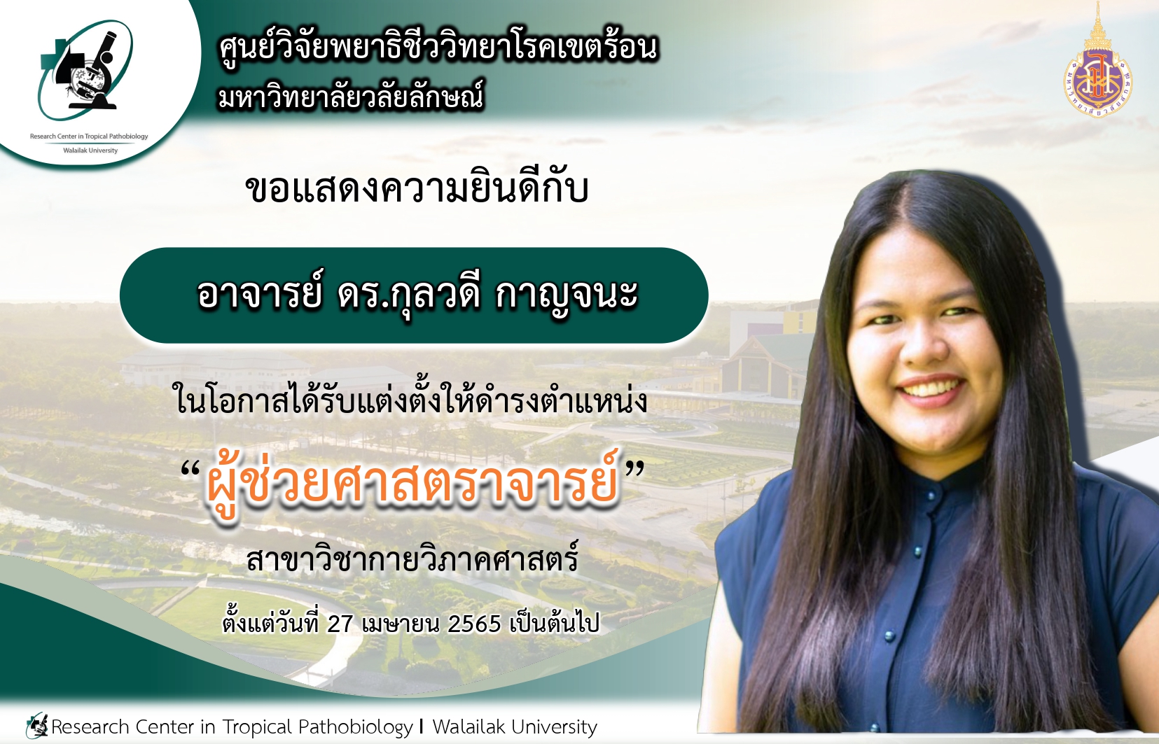/*! elementor – v3.11.0 – 13-02-2023 */ .elementor-widget-image{text-align:center}.elementor-widget-image a{display:inline-block}.elementor-widget-image a img[src$=”.svg”]{width:48px}.elementor-widget-image img{vertical-align:middle;display:inline-block} Research Center in Tropical Pathobiology congratulations to Dr.Kulwadee Karnjana on the occasion of being appointed as “Assistant Professor” in Anatomy. The appointment has been in effect on 27 April 2022 onwards.